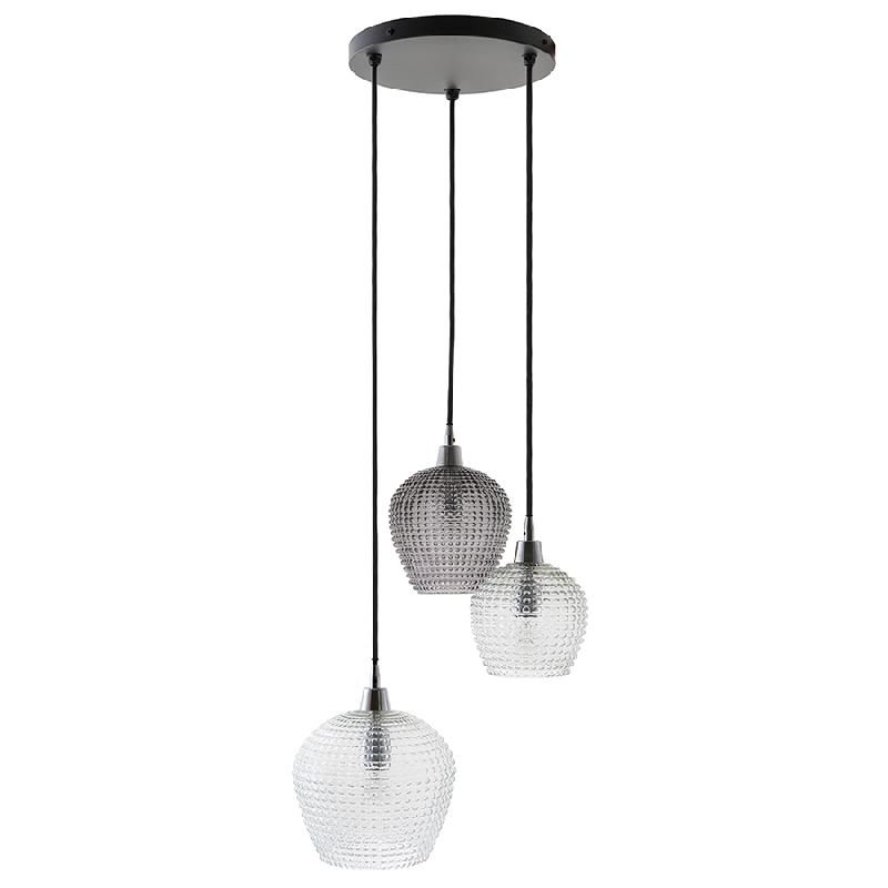 Материалы: стекло, железо. Размеры светильника: 50х50х150 см. Размеры плафонов: Средний: верхний диаметр – 18 см; нижний диаметр – 12 см; высота – 18 см. Два крайних: верхний диаметр – 24 см; нижний диаметр – 15 см; высота – 24 см. Цвет: серый/прозрачный. Длина провода: 1,1 м, 1,3 м, 1,5 м. Тип цоколя: 3хЕ27. Максимальная мощность ламп: 3х25 Вт. Степень пылевлагозащиты: IP20. Площадь освещения: 5 кв.м. Лампы в комплекте: нет.