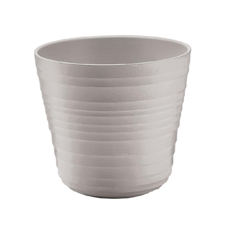 Кашпо для комнатных растений выполнено из переработанного пластика. Дизайн изделия напоминает керамику, а реалистичности внешнему виду придают тщательно подобранные пастельные тона и неровные круговые узоры, создающие эффект ручной работы.