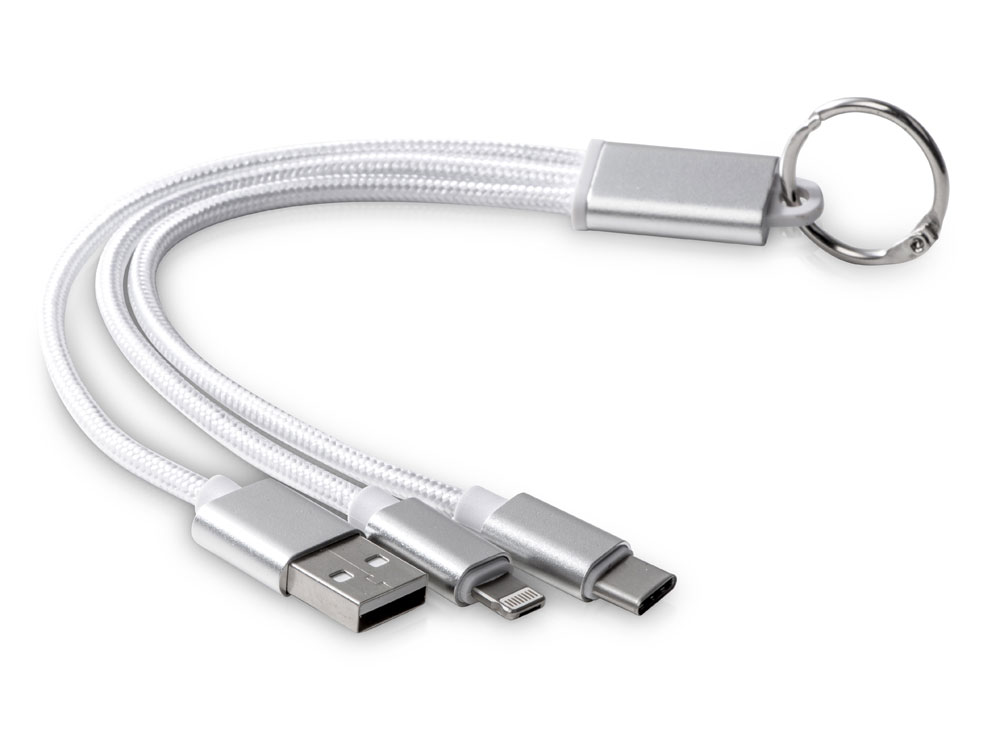 Кабель для зарядки Tres 3-в-1 с брелоком, коннекторами 1 type с, 1 USB type A и двойным совместимым коннектором 2-в-1 для устройств с ОС Apple® iOS и Android. В комплект входит брелок. Для зарядки устройств Apple подключайте кабель стороной без контактов; для зарядки устройств с ОС Android подключайте кабель стороной с контактами. Алюминий.