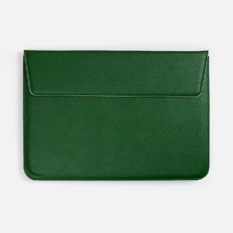 Чехол для ноутбука с диагональю до 15,6 выполнен из материала Petrus, зеленого цвета, дополнен окрашенным срезом края серого цвета.