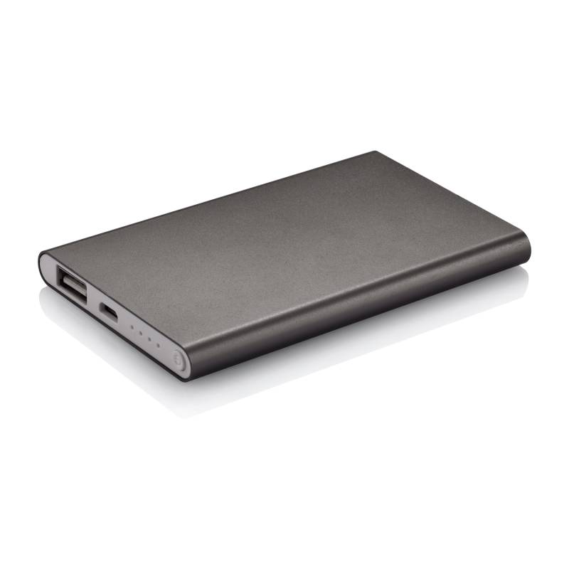 Тонкое зарядное устройство в прочном алюминиевом корпусе со встроенным литий полимерным аккумулятором емкостью 4000 mAh. На корпусе расположена кнопка вкл/выкл и индикаторы уровня заряда. Поставляется в подарочной коробке. Максимальная мощность на выходе 5V/1А, на входе: 5V/800 mAh. В комплекте кабель micro-USB.