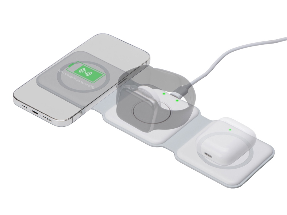 Беспроводная зарядная станция 3 в 1 — это современное решение для быстрой и удобной зарядки ваших устройств. Эта компактная и практичная модель позволяет заряжать сразу три устройства одновременно- любой смартфона и наушники с поддержкой беспроводной зарядки по протоколу Qi, и часы Apple.