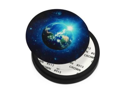 Благодаря миниатюрному размеру устройства и идеальной форме круга, вы не сразу угадаете его назначение. Этот предмет создан для тех, кто предпочитает гармонично встраивать технологии в ежедневную жизнь, деликатно скрывая их под маской обычных вещей. Главная функция устройства — беспроводная зарядка — реализуется качественно и бесперебойно. В комплекте с изделием в разобранном виде поставляется круглое закаленное стекло, на котором можно сделать красочное нанесение любого изображения. После запечатки стекло легко крепится на корпус устройства.