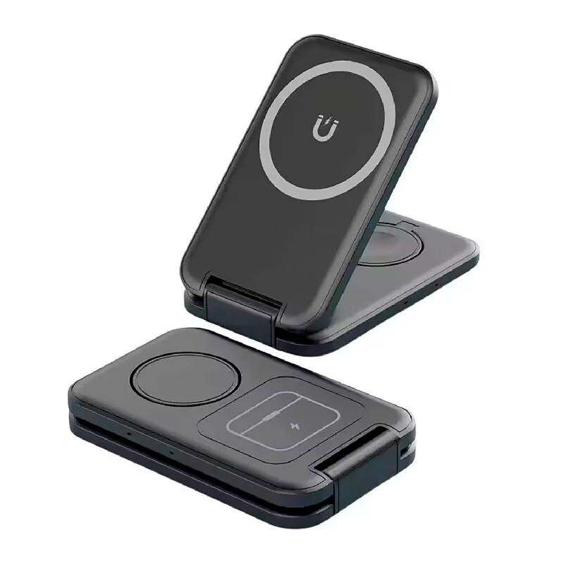 Компактный гаджет - складная беспроводная (15W) зарядная станция 3-в-1 с функцией MagSafe - магнитным держателем для iPhone двенадцатой серии и выше. Данный держатель позволяет закрепить (примагнитить) iPhone горизонтально на зарядном блоке для удобного просмотра фото/видео на его экране. Для большего удобства в конструкции подставки предусмотрены 2 угла обзора экрана.