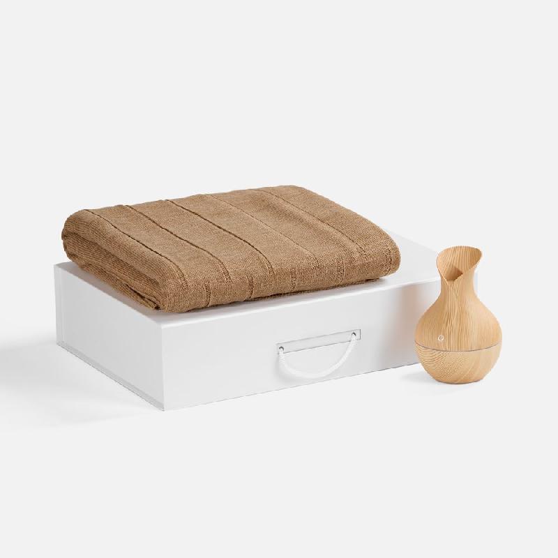 Плед с мягкой текстурой приглашает расслабиться в тепле, а изящный увлажнитель-ароматизатор создает в помещении атмосферу гармонии.