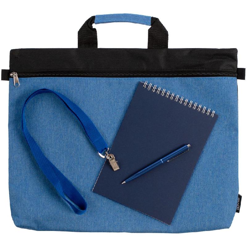 сумка - полиэстер; блокнот - картон, бумага; лента для бейджа - нейлон; ручка - пластик, металл