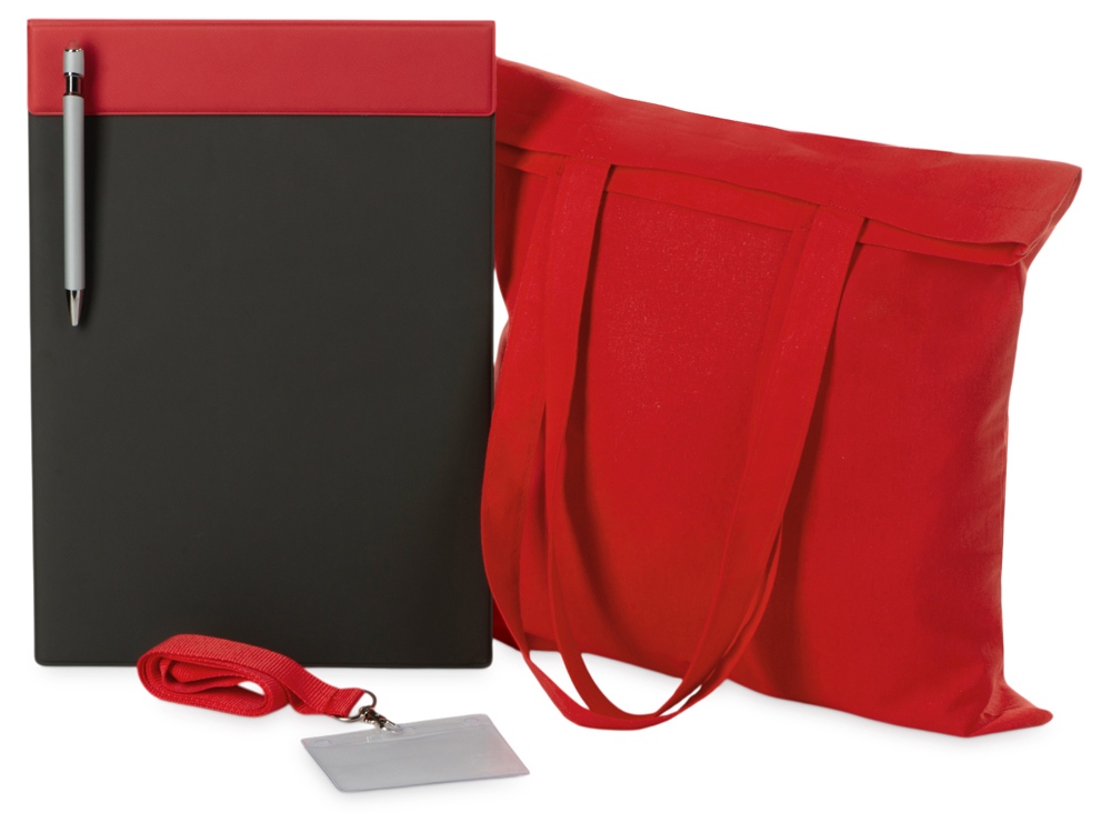 Базовый набор для конференций. В наборе: магнитный планшет для бумаг, ручка для записей, ланъярд и чехол для бейджа участника и шоппер, в который все можно удобно сложить.