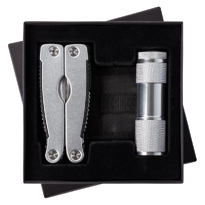 фонарик - алюминий; мультитул: инструменты - нержавеющая сталь; рукоятки - алюминий; чехол - полиэстер; коробка - картон