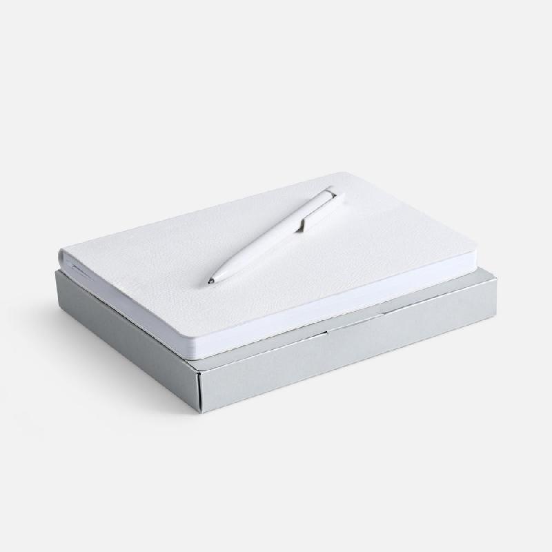 Недатированный ежедневник с гибкой обложкой из фактурного материала La Fite и металлическим шильдом на ляссе и ручка в тон, упакованные в подарочную коробку из дизайнерского картона.