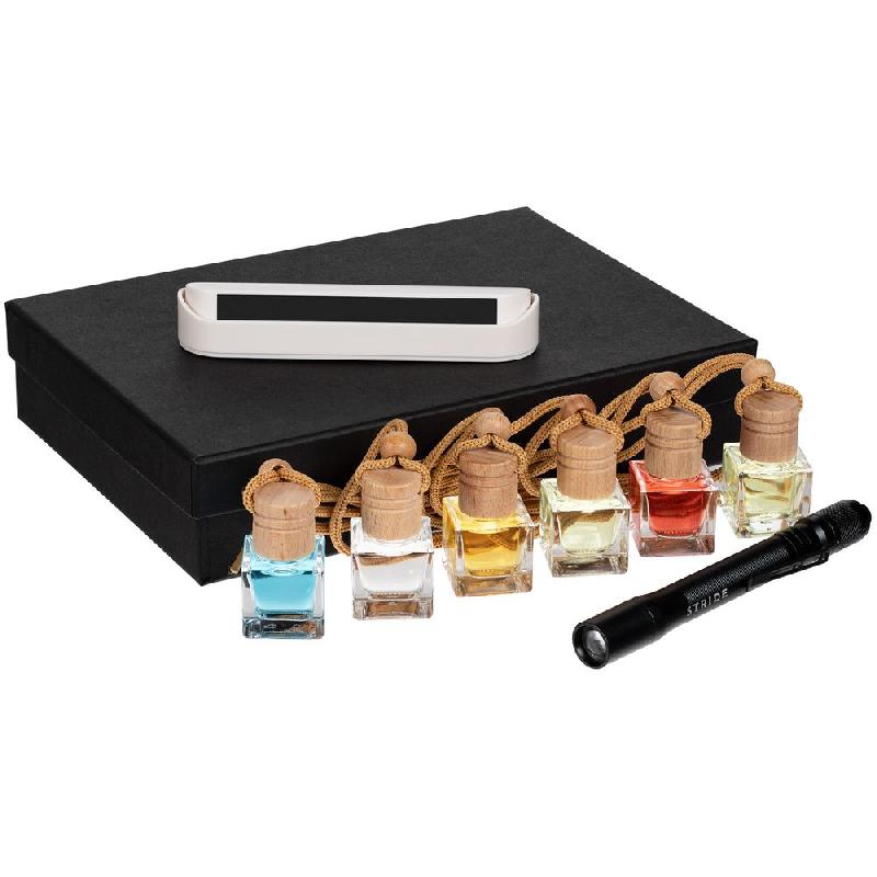 ароматизатор - стекло, дерево; коробка - переплетный картон; визитка - пластик; фонарик - алюминий