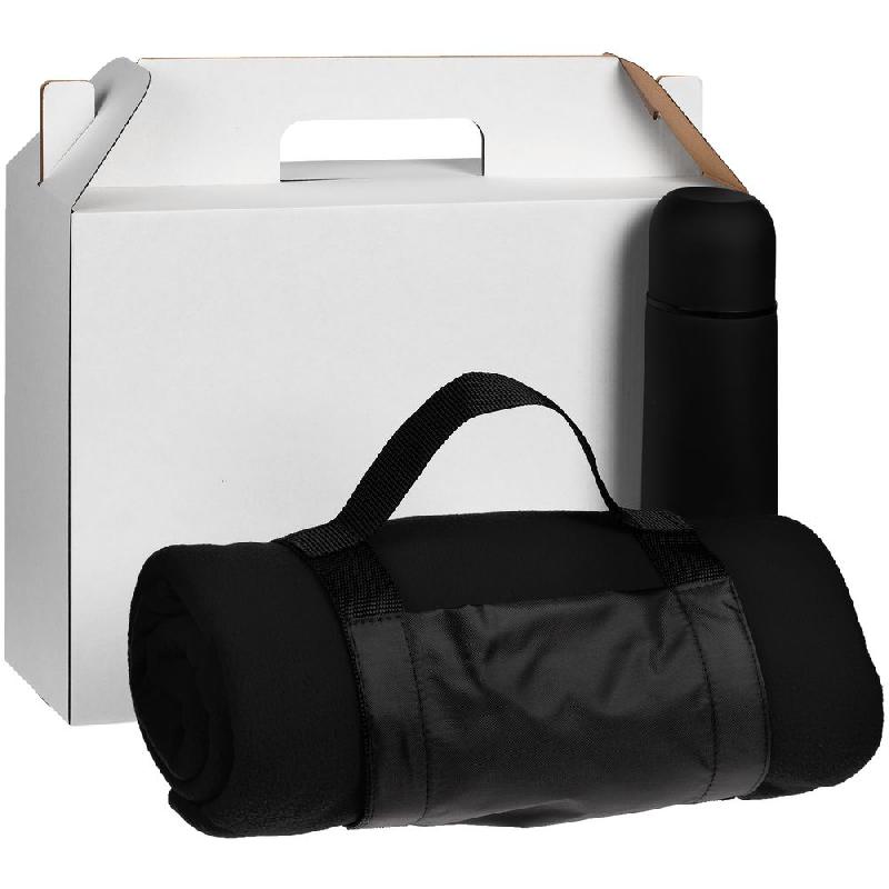 плед - флис, плотность 180 г/м²; термос - нержавеющая сталь, 304 внутри, 201 снаружи, пластик, покрытие софт-тач; коробка - микрогофрокартон