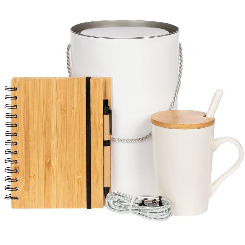 кружка с ложкой - фарфор, нержавеющая сталь, бамбук; кабель - алюминий, нейлон, искусственная кожа; блокнот с ручкой - бамбук, картон, пластик; тубус - переплетный картон, жесть