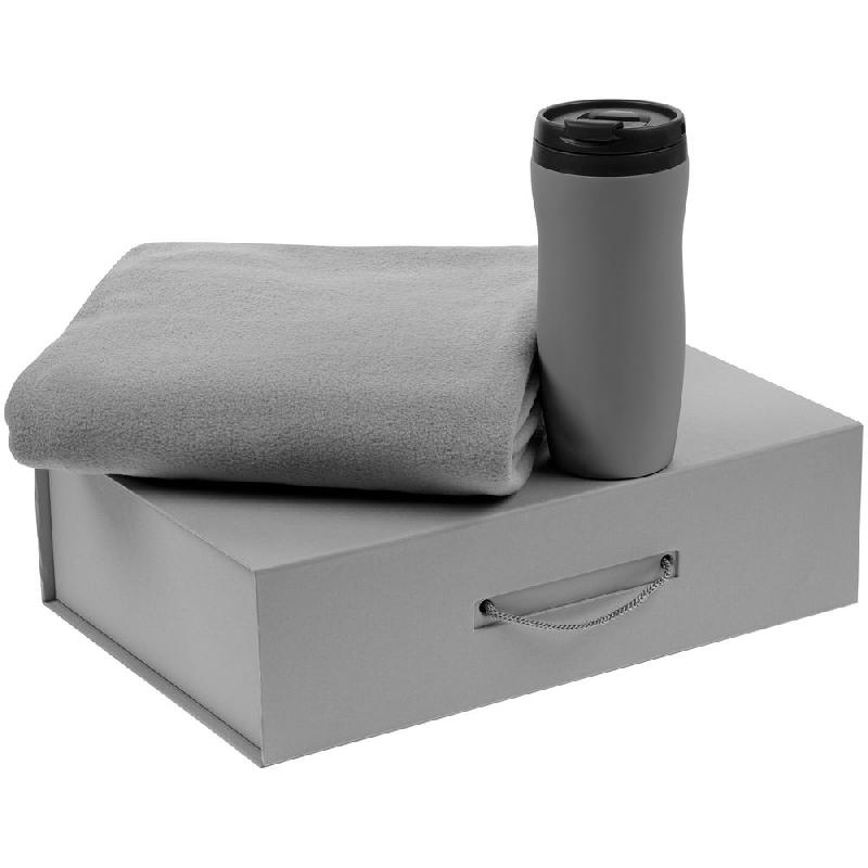 крышка, внутренняя колба - пластик; корпус - нержавеющая сталь; покрытие софт-тач; плед - флис, плотность 180 г/м²; коробка - переплетный картон; наполнитель - бумага