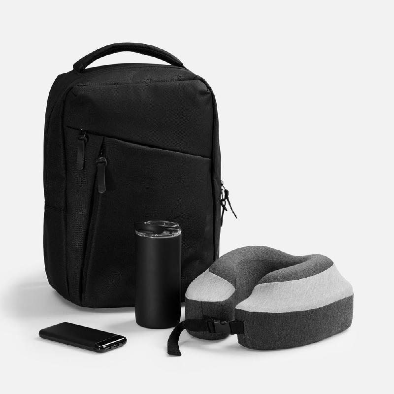 Этот стильный комплект включает в себя все необходимое для комфортных путешествий: практичный рюкзак, мощный внешний аккумулятор, уютную дорожную подушку и термостакан.