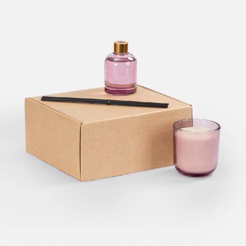 флакон, подсвечник - стекло, палочки из файбера; свеча - воск; коробка - микрогофрокартон, плотность 385 г/м²