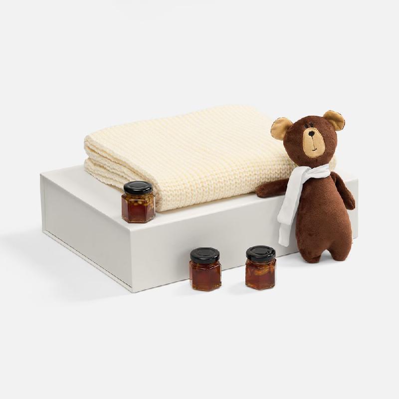 шарф - акрил 100%; игрушка - велюр; набивка, шарфик - полиэстер 100%; баночки для меда - стекло; коробка - переплетный картон, бумага Majestic