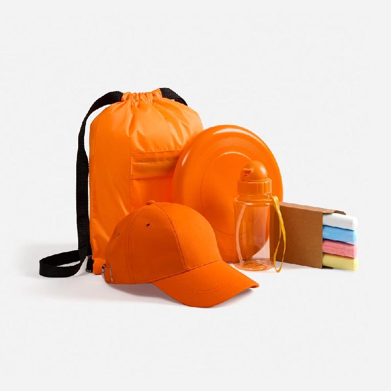 Детский набор для творчества: 4 цветных мелка, бутылка для воды, стильная бейсболка с защитой от солнца, тарелка-фрисби для самых активных и яркий детский рюкзак-мешок — все, что нужно для творческих приключений на свежем воздухе.