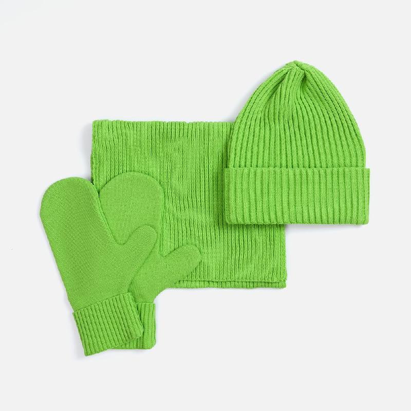 В набор входят удобный шарф с технологичным отверстием для быстрого завязывания, шапка с двойным отворотом и теплые двухслойные варежки с широкой манжетой. Все изделия связаны из акриловой пряжи, отличаются практичностью и элегантной простотой.