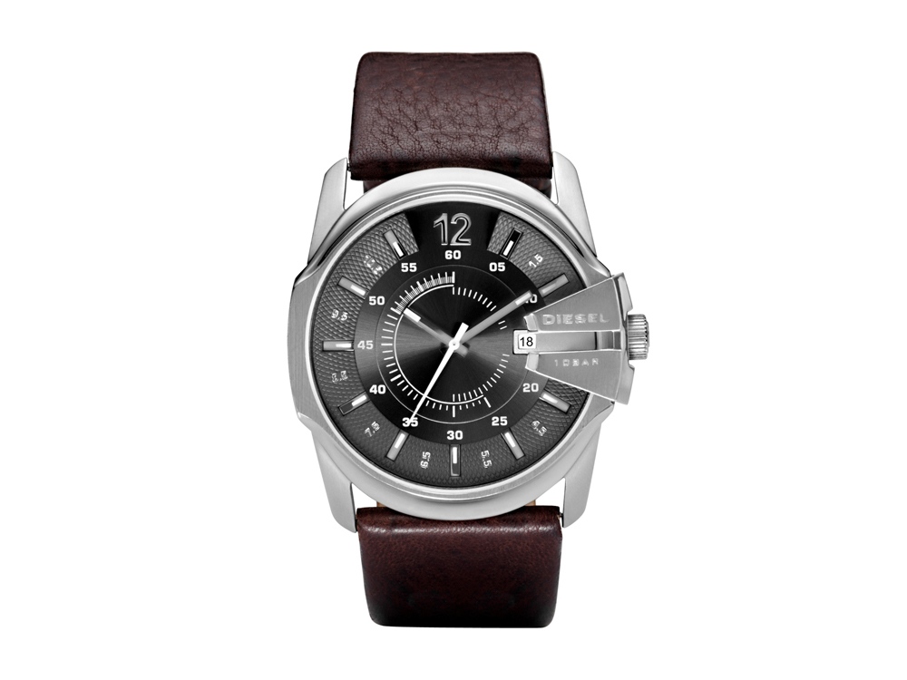 корпус- стальной, циферблат- темно-серый, крепление- коричневый
