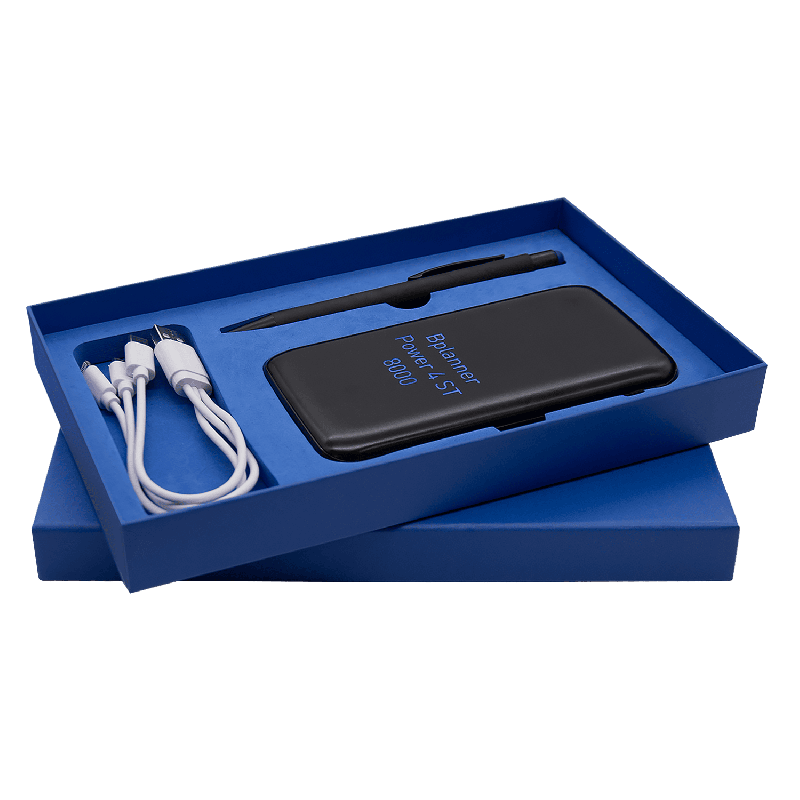 – отличный вариант для welcome pack! Он содержит все самое необходимое: емкий внешний аккумулятор Bplanner, металлическую ручку и подарочную коробку с цветным ложементом.