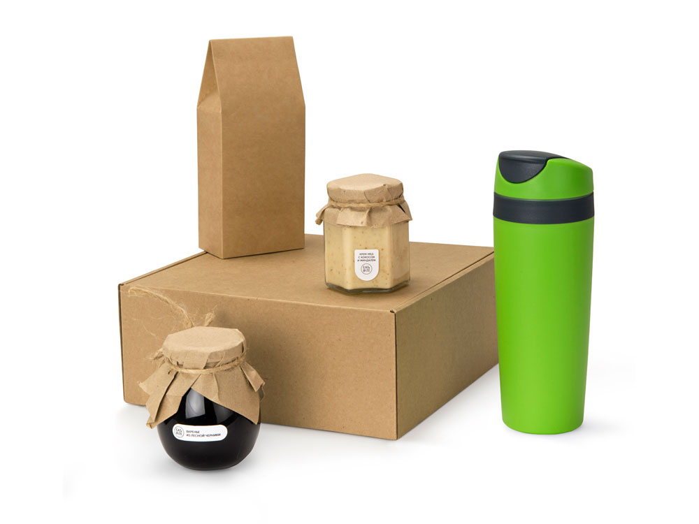 Набор состоит из термокружки, баночки крем-мёда с кокосом и миндалём, варенья из сосновых шишек, чёрного чая. Набор упакован в крафтовую картонную коробку с бумажным наполнителем.