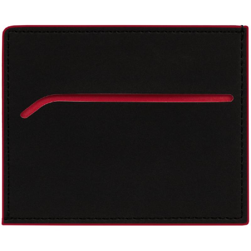 Чехол выполнен из материала Soft Touch Pearl, черный АА, дополнен окрашенным срезом края и внутренним карманом из цветного картона. Имеет 4 отделения для кредитных карт и 1 отделение для купюр.