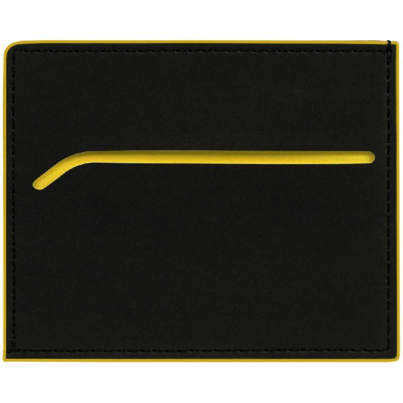 Чехол выполнен из материала Soft Touch Pearl, черный АА, дополнен окрашенным срезом края и внутренним карманом из цветного картона. Имеет 4 отделения для кредитных карт и 1 отделение для купюр.