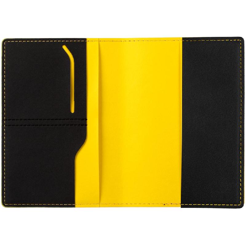 Имеет основное отделение для паспорта и 2 отделения для визиток или кредитных карт.