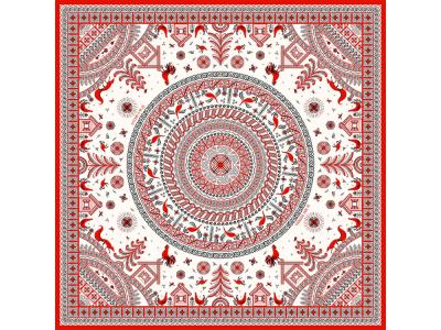 Самобытный орнамент знаменитой мезенской росписи, отличающейся зашифрованным символизмом, лег в основу элегантного платка Мезенская роспись. Петух и лиса. Каждый элемент принта имеет особое значение, и располагается в строго определенном месте, создавая целый рассказ. Ранее такими рисунками украшали избы, посуду и кухонную утварь, передавая послание поколениям.