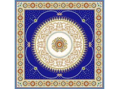 В центре полотна размещен изящный медальон, повторяющий оригинальный рисунок севрского фарфора, выполненного в ювелирной технике накладных эмалей и словно украшенного россыпью драгоценных камней. Цветовой строй воспроизводит парадную эстетику дворцового фарфора, где глубокий королевский синий в сочетании с золочёным орнаментом образуют гармоничное звучание.