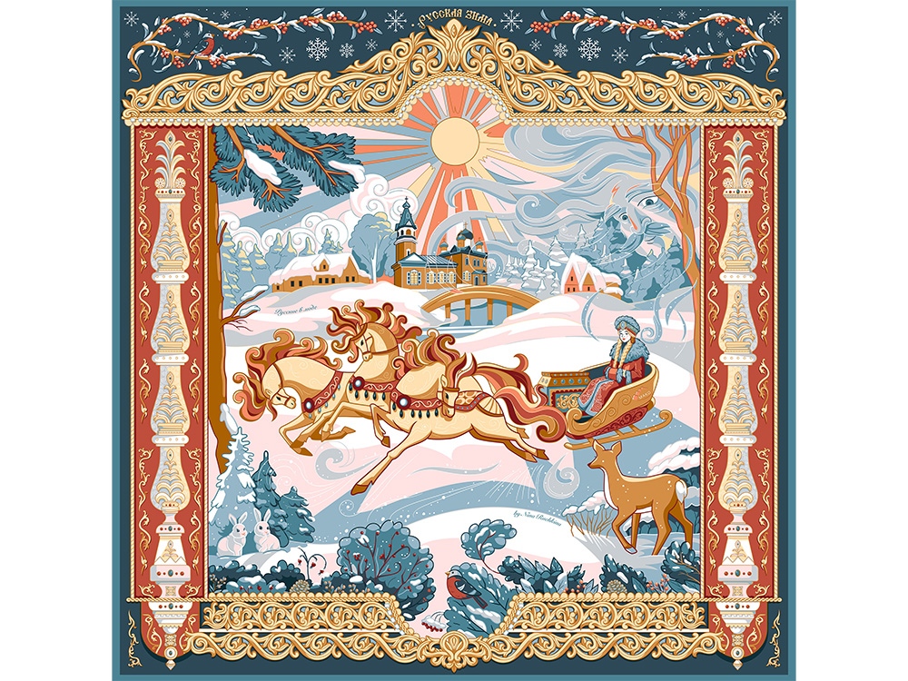 Художественное пространство выстроено подобно книжной иллюстрации, где центральный сюжет раскрывается в обрамлении узоров по мотивам деревянного зодчества. Тройка лошадей, сани с красной девицей, стилизованный облик Деда Мороза или Морозко, ели, припорошенные снегом, в окружении добрых лесных зверей, – наполнены глубоким символизмом и создают атмосферу волшебства. Православные церкви среди пышных сугробов, озаренные яркими солнечными лучами, знаменуют торжество веры, возрождения и любви.
