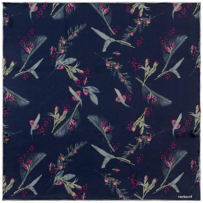 Шелковый платок глубокого синего цвета с принтом из листьев и цветов в гербарном стиле.Поставляется в подарочной упаковке.