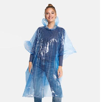Одноразмерный прозрачный дождевик для взрослых с капюшоном и отверстиями для рук. Поставляется в мешочке из LDPE размером 10 x 13,5 см.