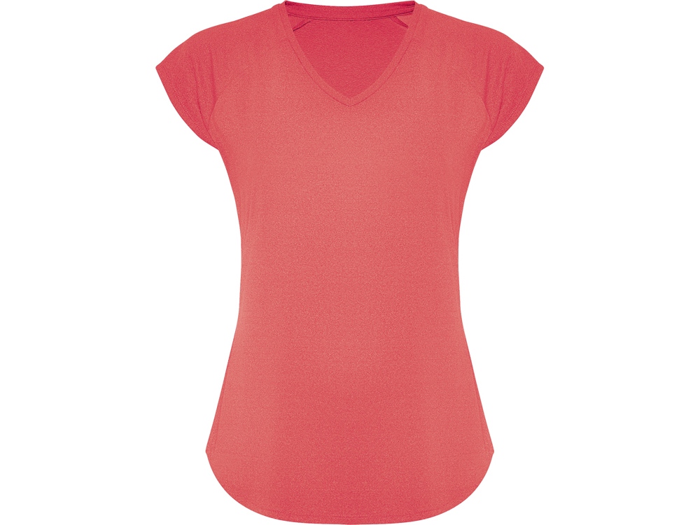 Спортивная женская футболка с коротким рукавом реглан. Вырез горловины V. Полотно из полиэстера на ощупь напоминающее хлопок. Приталенный силуэт.