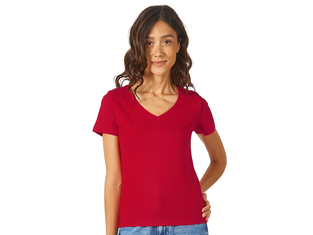 Женская футболка из натурального хлопка с элегантным V-образным вырезом. Материал отлично подходит для нанесения рекламной информации. Натуральная ткань не вызывает раздражения кожи.