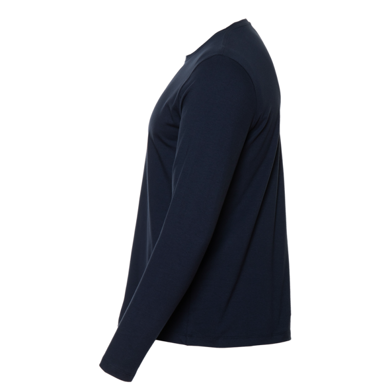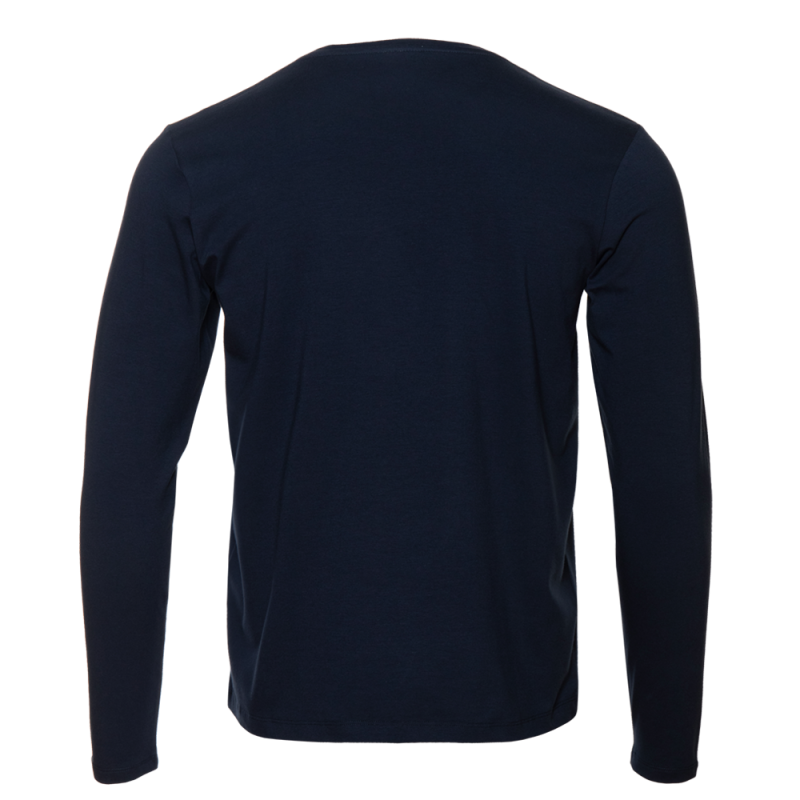Универсальная футболка прямого силуэта с округлым воротом и длинным втачным рукавом. Плечевые швы и шов горловины усилены настрочной бейкой из основного полотна.