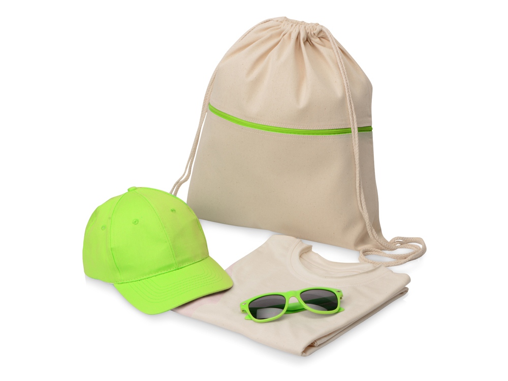 рюкзак- натуральный/зеленое яблоко, футболка- натуральный, бейсболка- зеленое яблоко, очки- зеленое яблоко