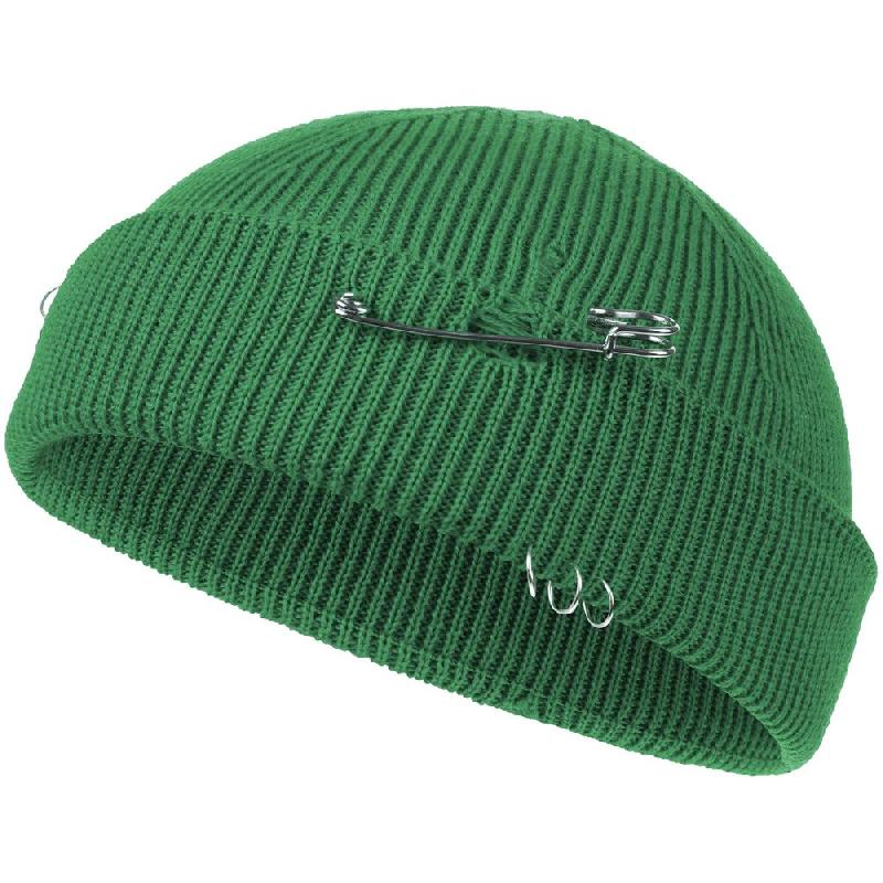 Однослойная шапка бини с рваным отворотом и металлическими аксессуарами для дерзких образов в любом возрасте. Яркий и запоминающийся акцент в стиле гранж.