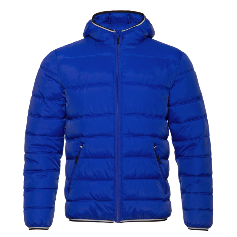 Мужская утеплённая куртка прямого силуэта с воротником-стойкой, переходящим в капюшон, втачным рукавом, прорезным карманом и застежкой на молнию с внутренней ветрозащитной планкой. Горизонтальная стежка надежно фиксирует наполнитель, препятствуя его миграции. Для дополнительной теплозащиты отлет капюшона, манжет и нижний край изделия окантованы контрастной резинкой.