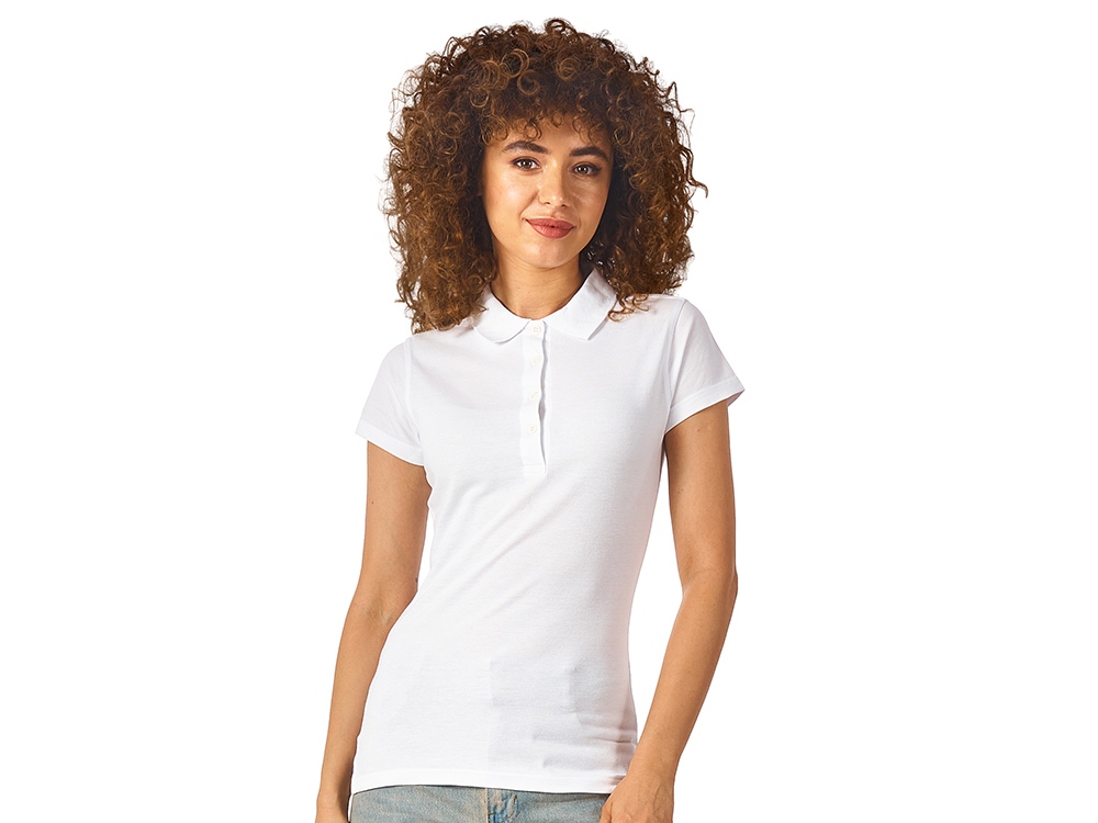 Женская рубашка-поло First. Воротник 1х1. Обшивка внутри воротника. Мужская и детская модели с 2 пуговицами, женская - с 4 пуговицами. Пуговицы с гравировкой в тон. Пике, 100% хлопок. 160 г/м2.