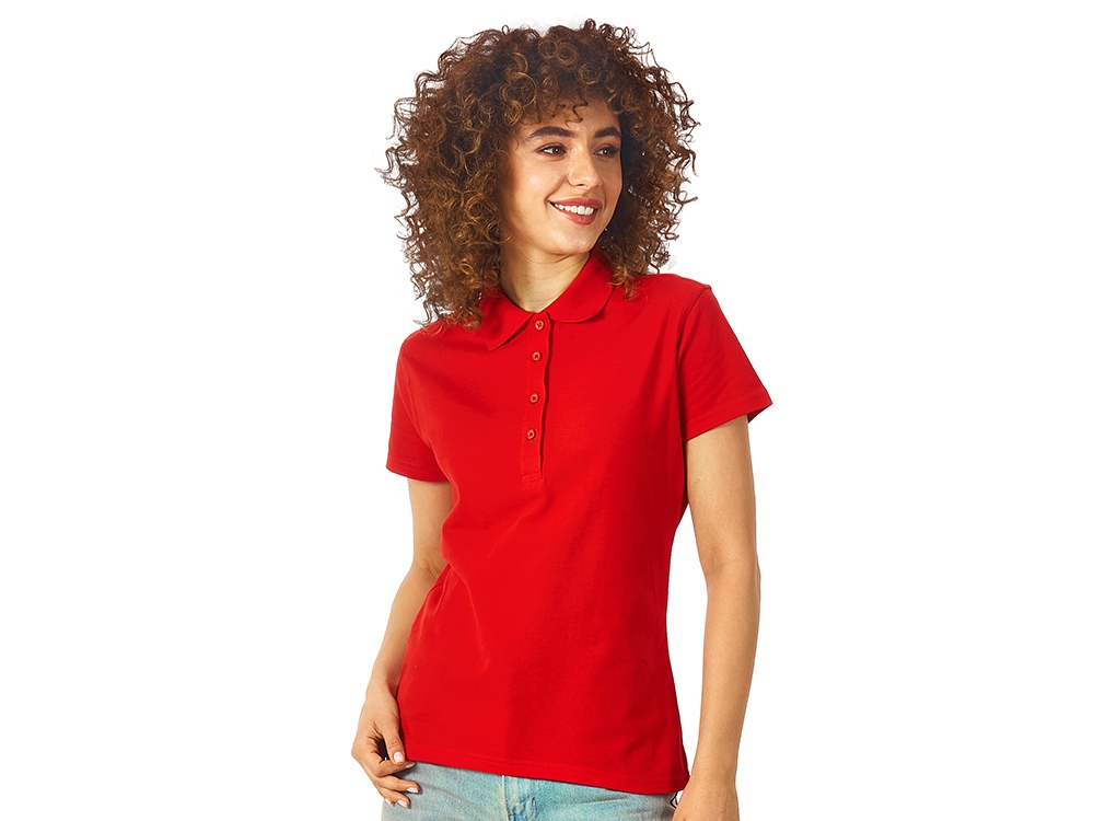 Женская рубашка-поло First. Воротник 1х1. Обшивка внутри воротника. Мужская и детская модели с 2 пуговицами, женская - с 4 пуговицами. Пуговицы с гравировкой в тон. Пике, 100% хлопок. 160 г/м2.
