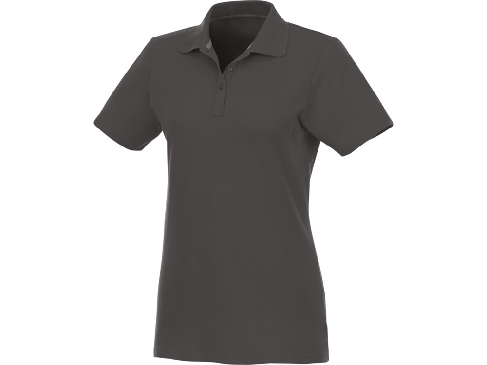 Женское поло Helios с коротким рукавом. Женская модель с разрезами по бокам. Отрезной-отрывной ярлык для комфорта. Воротник гладкой вязкой в рубчик. Планка с тремя пуговицами. Двойная строчка на воротнике и внизу изделия. Пуговицы в цвет изделия. Полоска на горловине в контрастном цвете. Трикотаж Piqué, 100 % хлопок. 180 г/м².