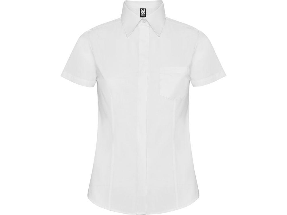 Рубашка женская прилегающего силуэта с вытачками на полочке и спинке с коротким рукавом. Накладной карман на груди слева, закругленный низ изделия. Планка с потайными пуговицами.