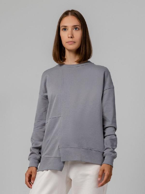 Свитшот унисекс свободного кроя со спущенным плечом и нестандартным нижним краем.