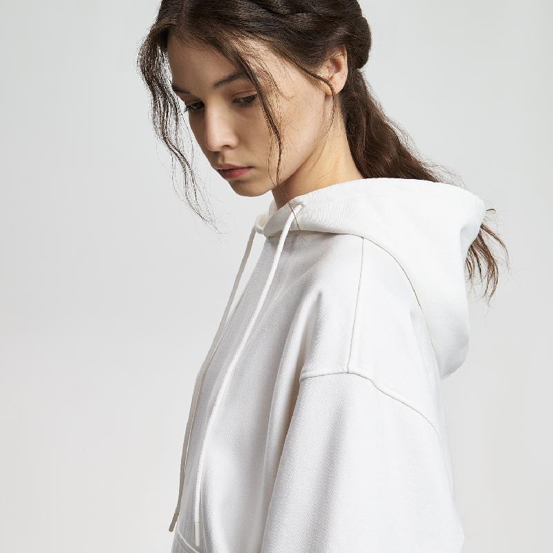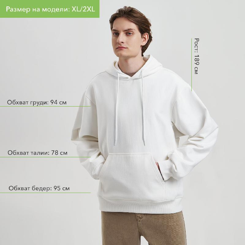 Модель выполнена из хлопкового футера плотностью 420 г/м (без начёса). Плотная, но мягкая ткань хорошо держит форму и при этом приятна к телу. Использована пряжа compact penye — прочная, тактильно деликатная, высокого качества.