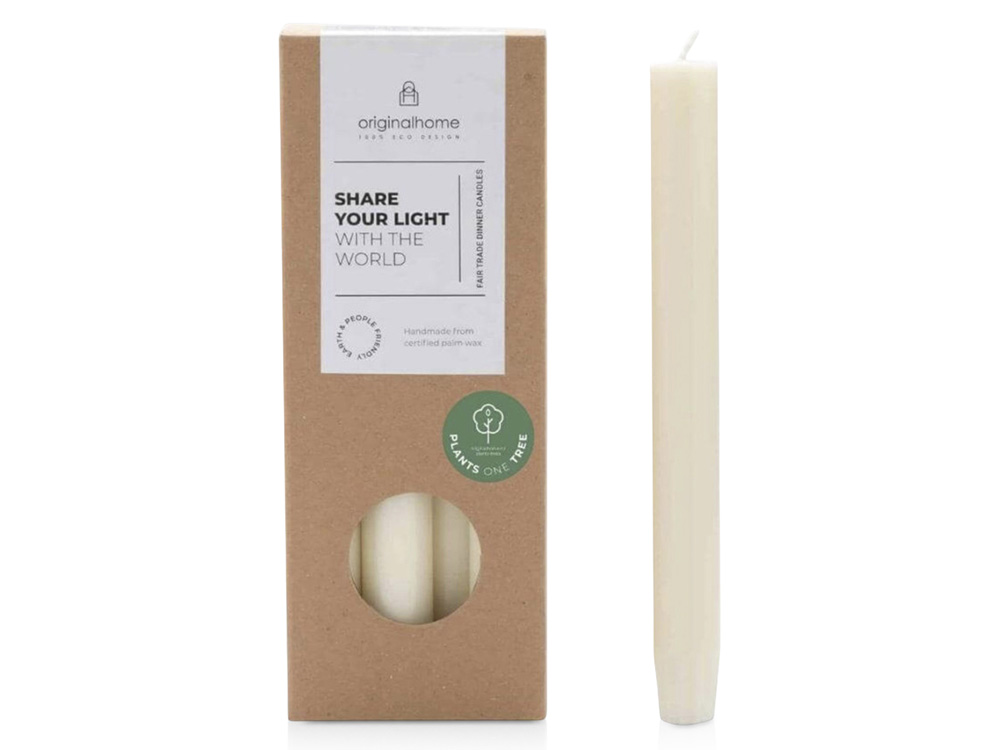 Столовая свеча от Originalhome на 100% натуральная и изготовлена вручную из сертифицированного пальмового воска. В комплект входят 10 свечей без запаха, упакованных в подарочную коробку. Каждая свеча горит примерно 7-8 часов.