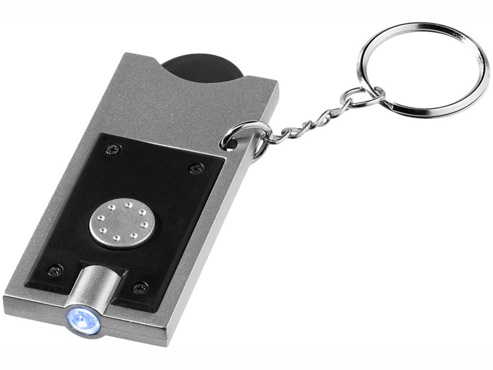 Брелок-держатель для монет Allegro с фонариком для ключей. Пластиковый держатель для монет достоинством 1 евро размером Ø 6 мм с одним белым светодиодом для ключей. Металлическое кольцо для ключей Ø 25 мм. Батарейки включены в комплект и вставлены. АБС-пластик.