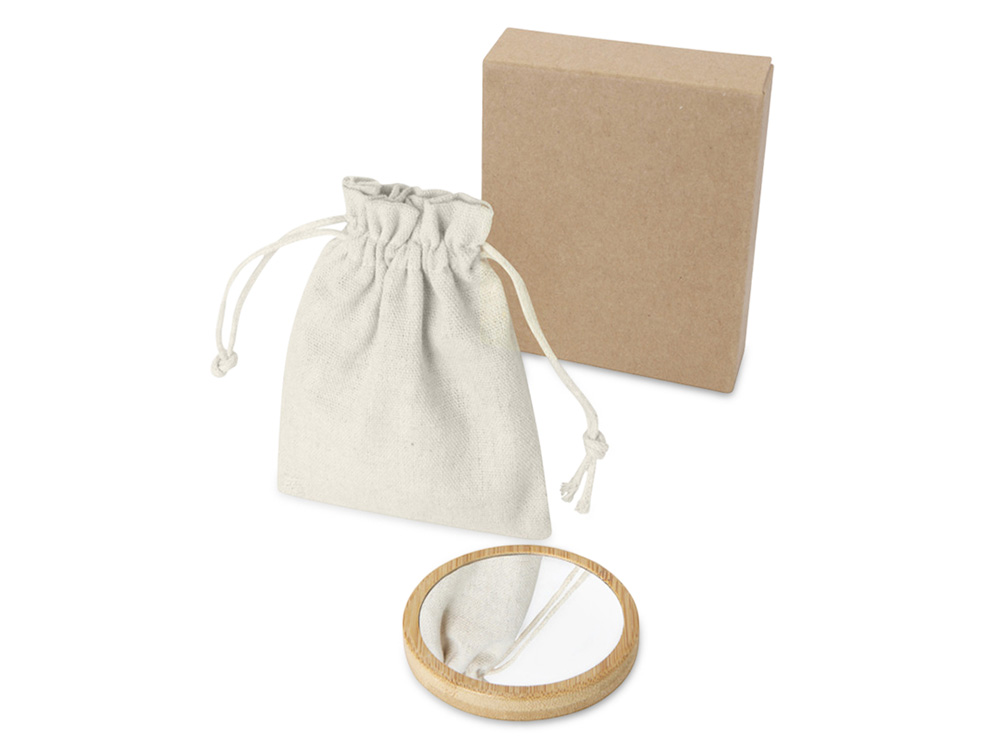 Круглое зеркало из бамбука в хлопковом мешочке.