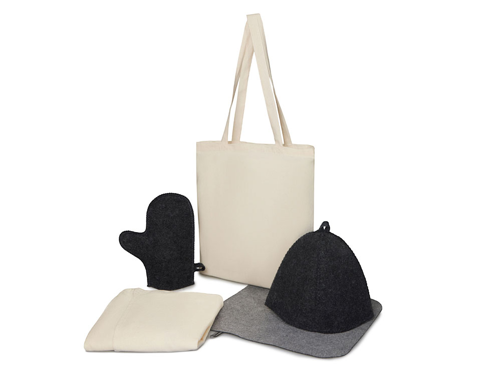 Создайте уют в парной: женский холщовый килт, шапка, коврик и рукавица — всё необходимое для отдыха, аккуратно сложено в хлопковый шоппер.