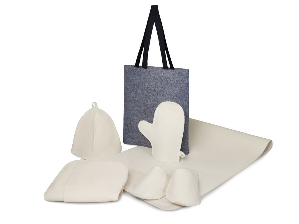 Женский банный набор Healing для комфортного отдыха: лежак для бани, холщовый килт-парео, рукавица, шапка и тапочки — всё аккуратно упаковано в стильный фетровый шоппер.